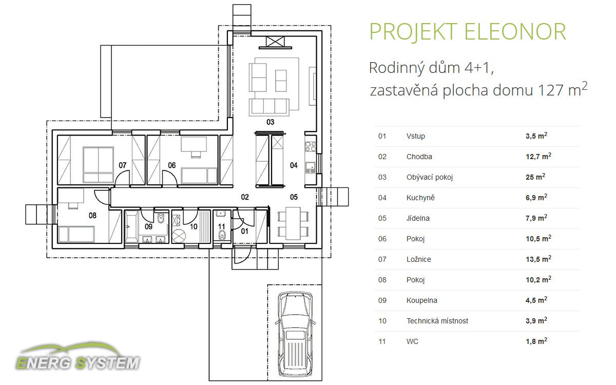 Jednopodlažní dům střední velikosti. Dům je určen pro 4 člennou rodinu, vstup je orientován na sever. Možnost variabilního uspořádání vnitřní dispozice. S terasou ...